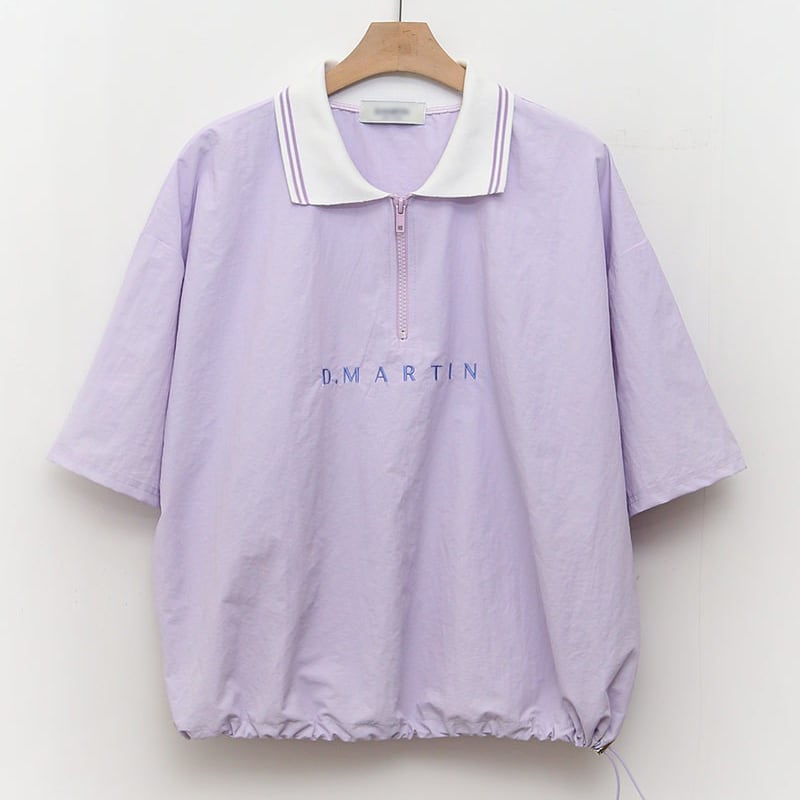 トップス:ハーフジップ仕様のポロシャツデザイン。ドローコード入りでシルエット調整可能。