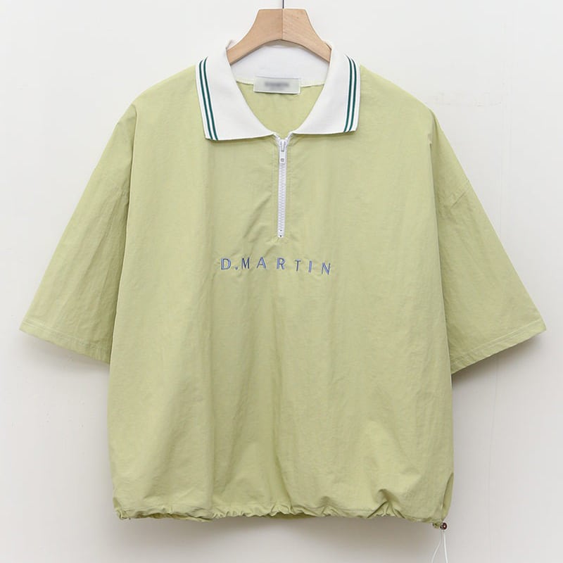 トップス:ハーフジップ仕様のポロシャツデザイン。ドローコード入りでシルエット調整可能。