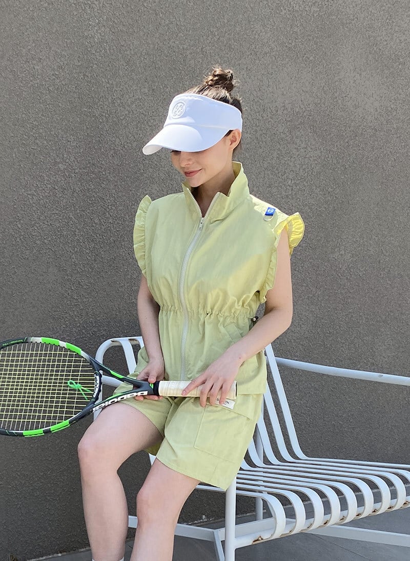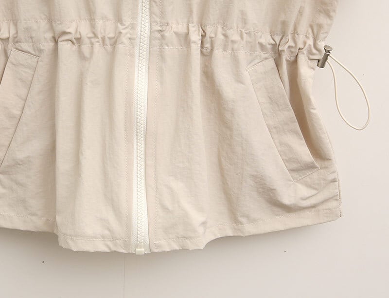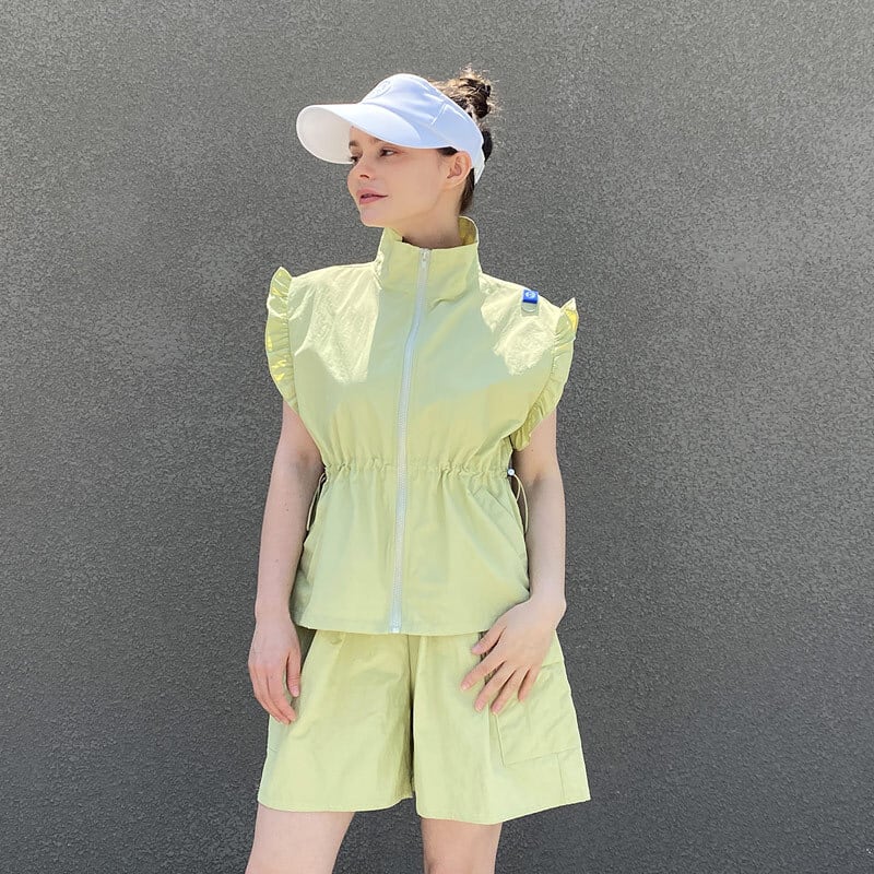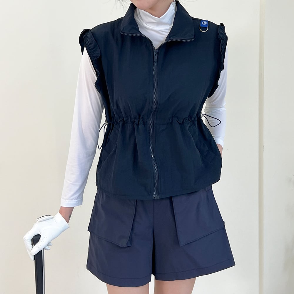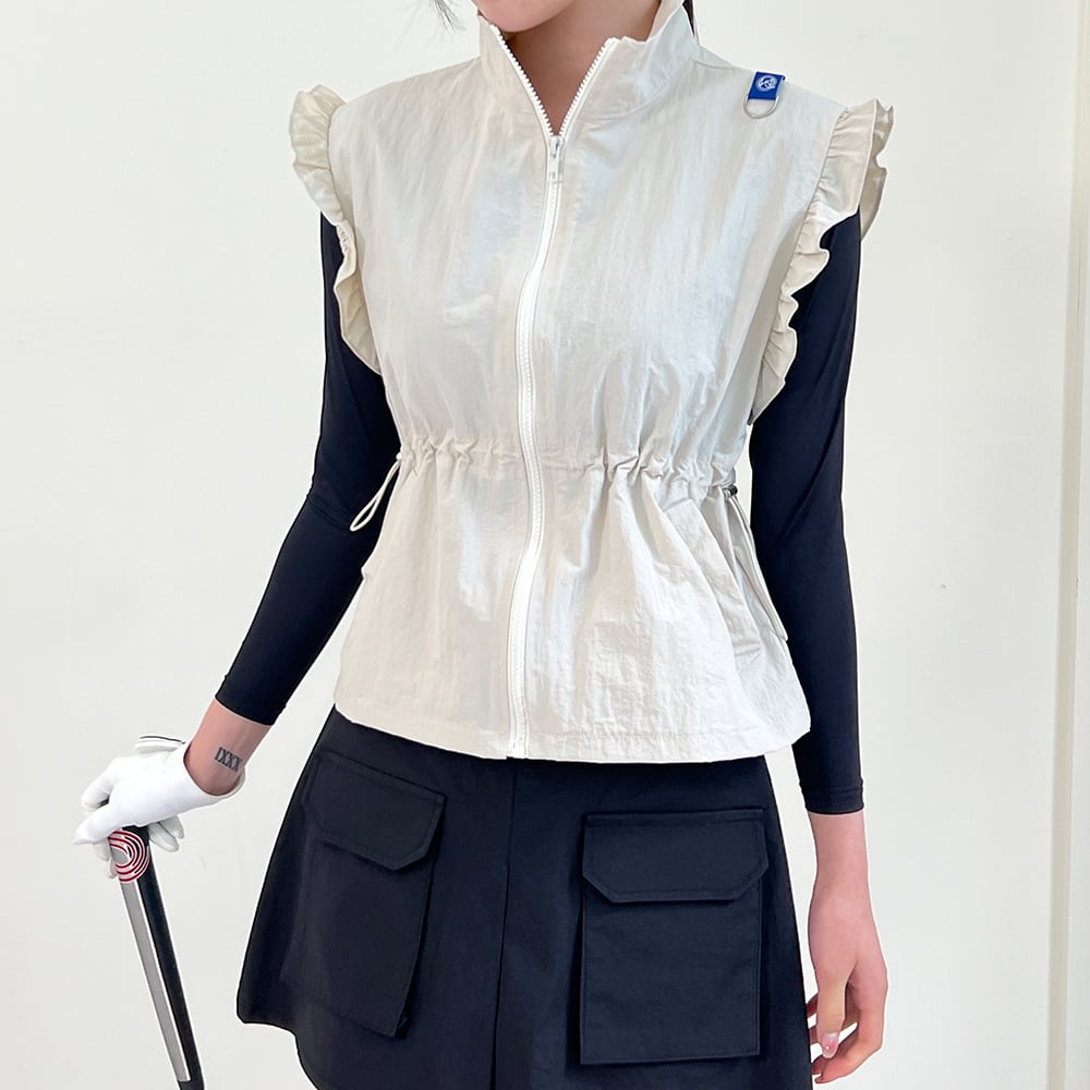 フリル袖が可愛らしいウエスト絞りジップアップベスト。
