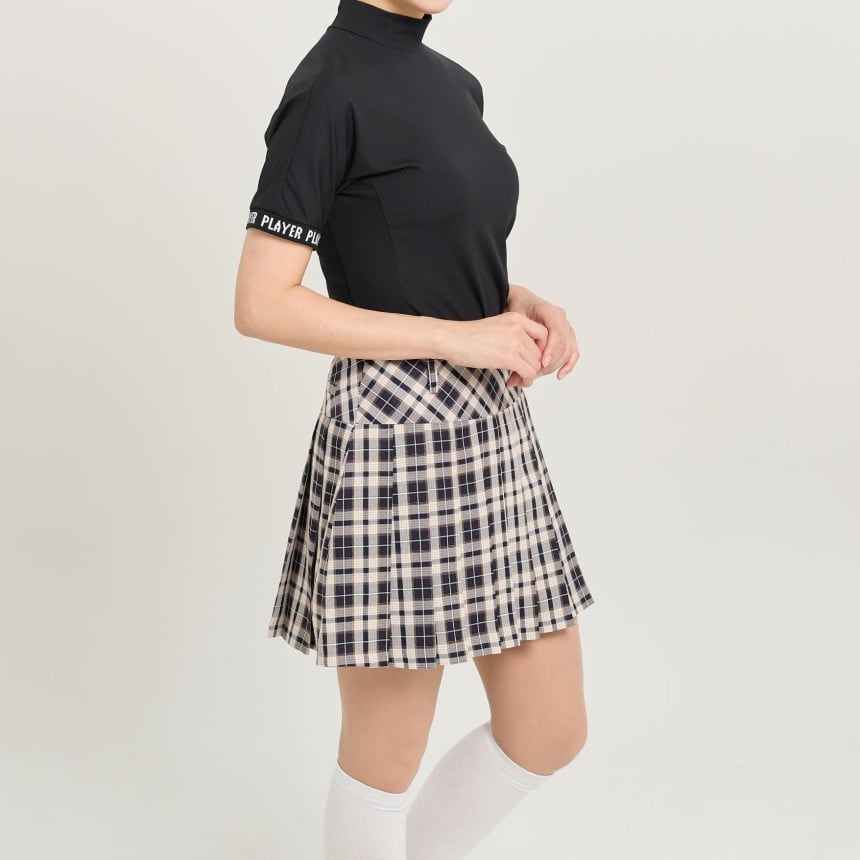 腰位置を高く見せるハイウエストデザインで、脚長効果抜群のゴルフスカート。
