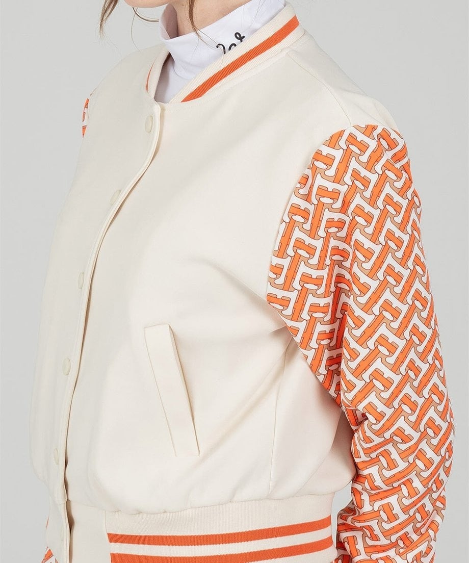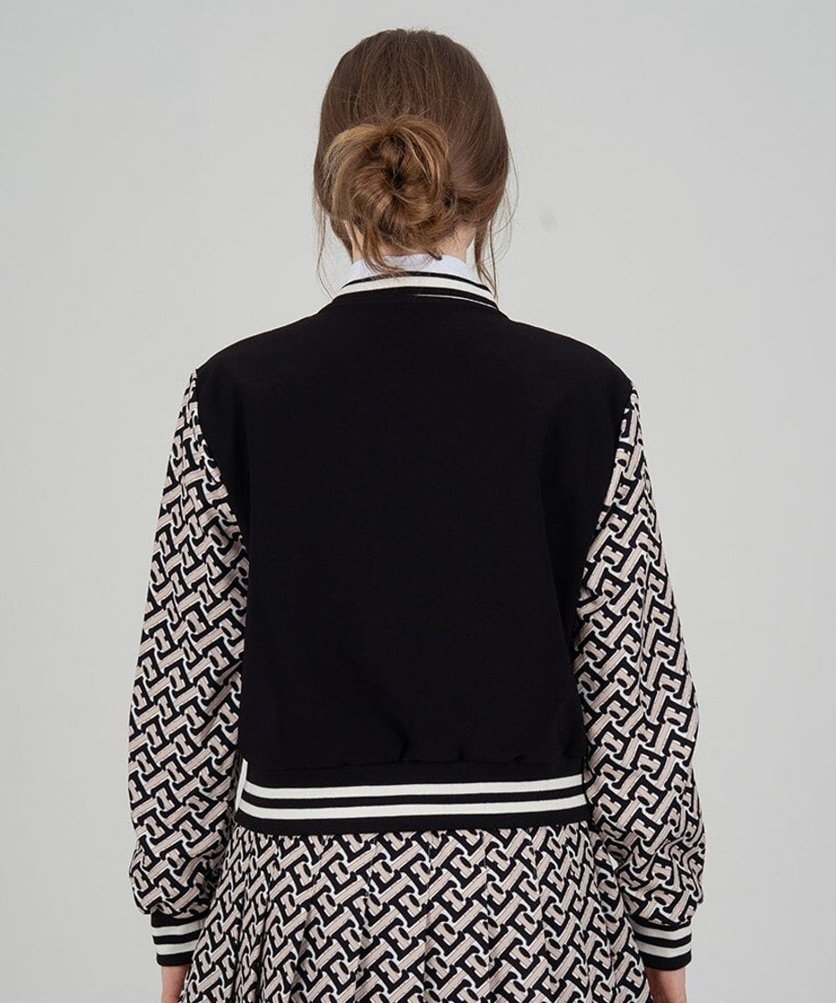 洗練されたバイカラーデザインのブルゾンと、統一感のあるパターンが特徴のスカートを組み合わせたスタイリッシュなセットアップ。