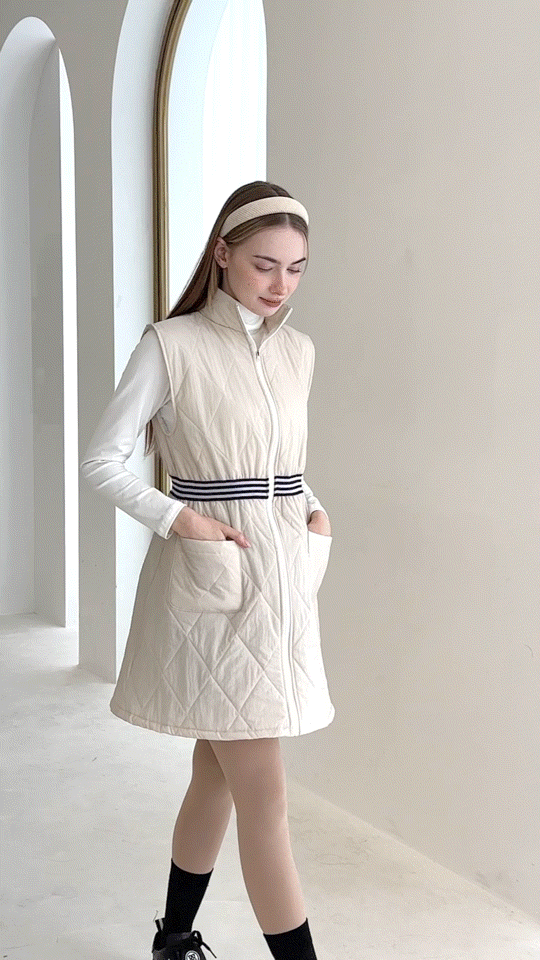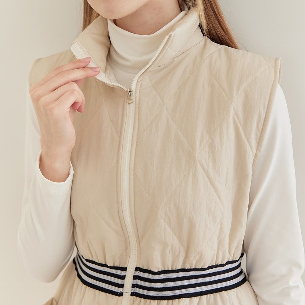 ウエストゴムのラインがスタイルアップを叶える、上品なキルティングロングベストワンピース。
