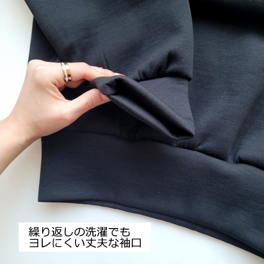 最大の特徴は袖口と裾に施された高密度リブ仕様で、繰り返しの洗濯や激しい動きでも伸びにくく、購入時の美しいシルエットを長く保つことができます。
