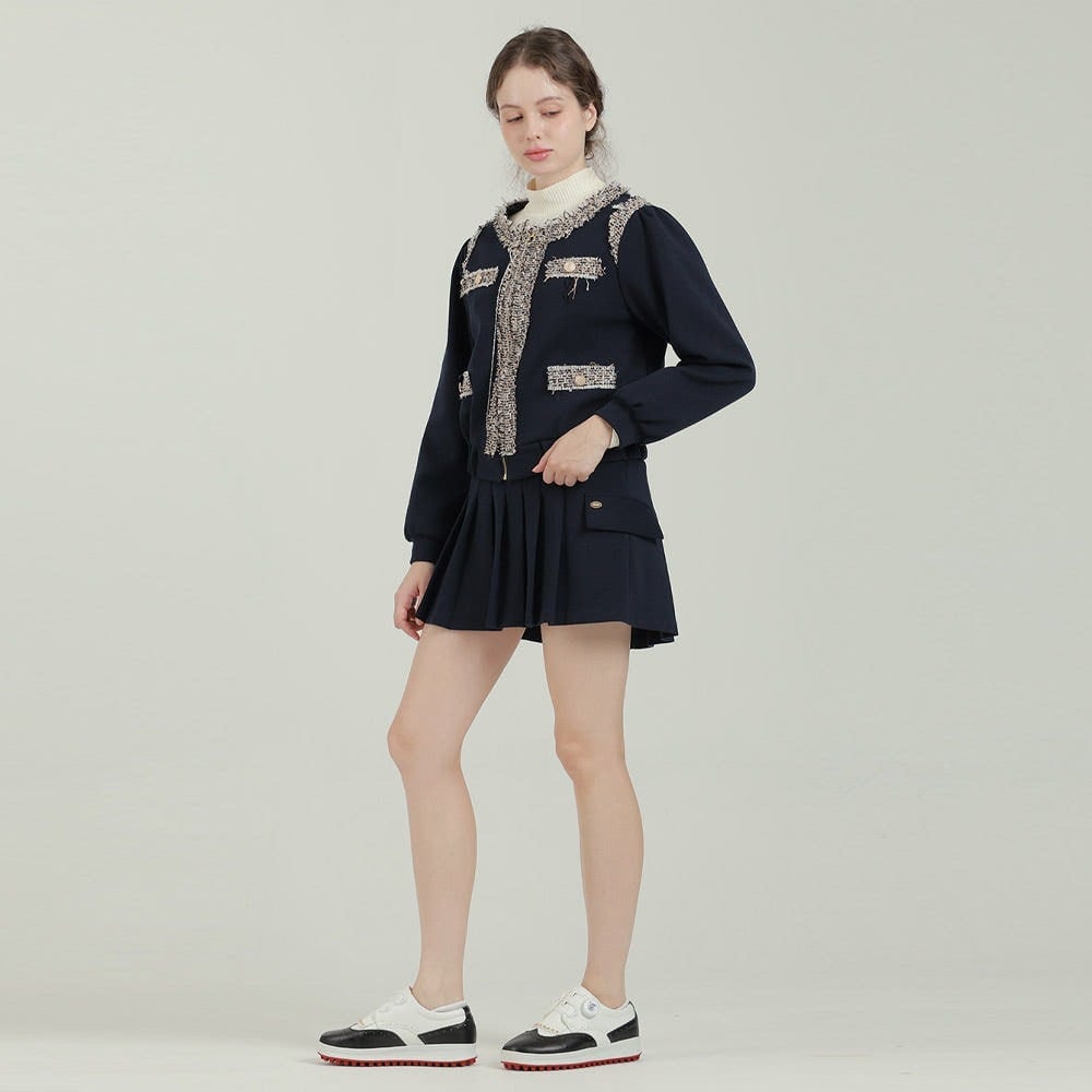高級感あふれるツイードのフリンジ装飾を贅沢に施した、ラグジュアリーなゴルフセットアップです。