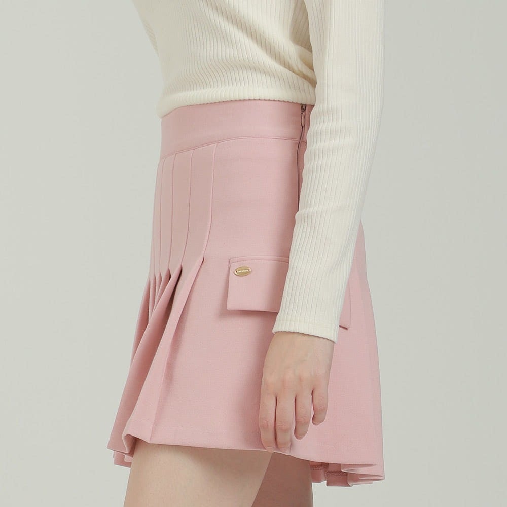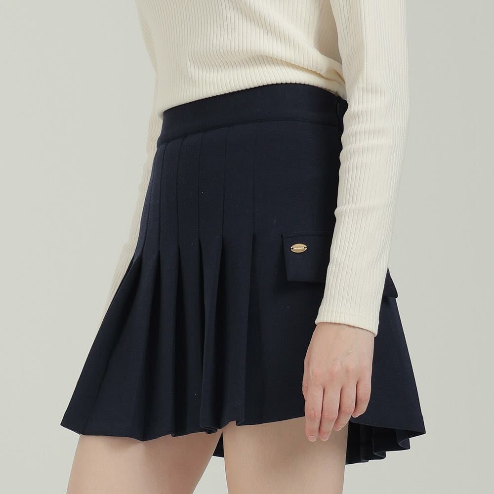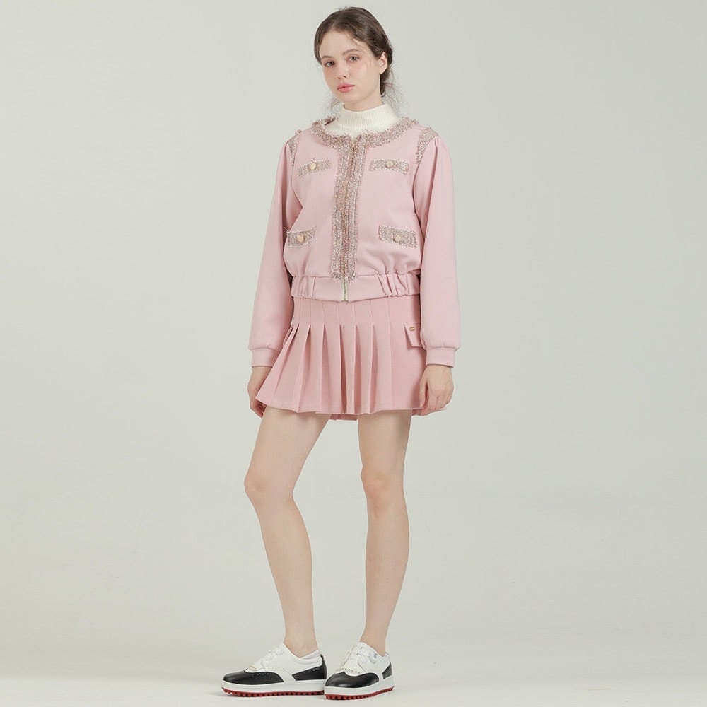 ノーカラーのすっきりとしたブルゾンと、プリーツスカートが組み合わさり、コース上でもパーティーシーンのような華やかさを演出します。