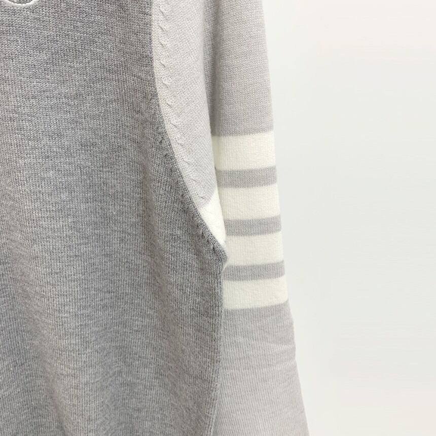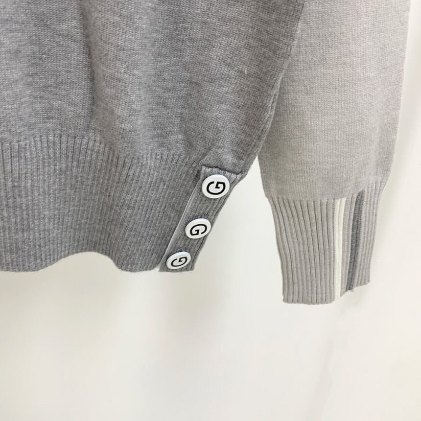 落ち着いたグレー、チャコール、ブラックのモノトーン配色に、清潔感のあるホワイトの襟元がアクセントになっています。