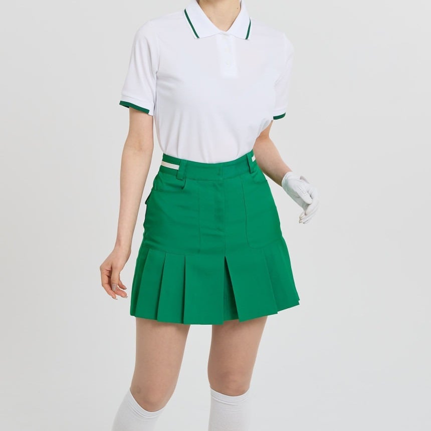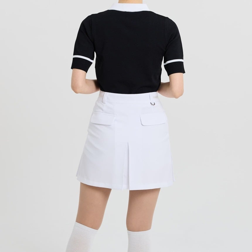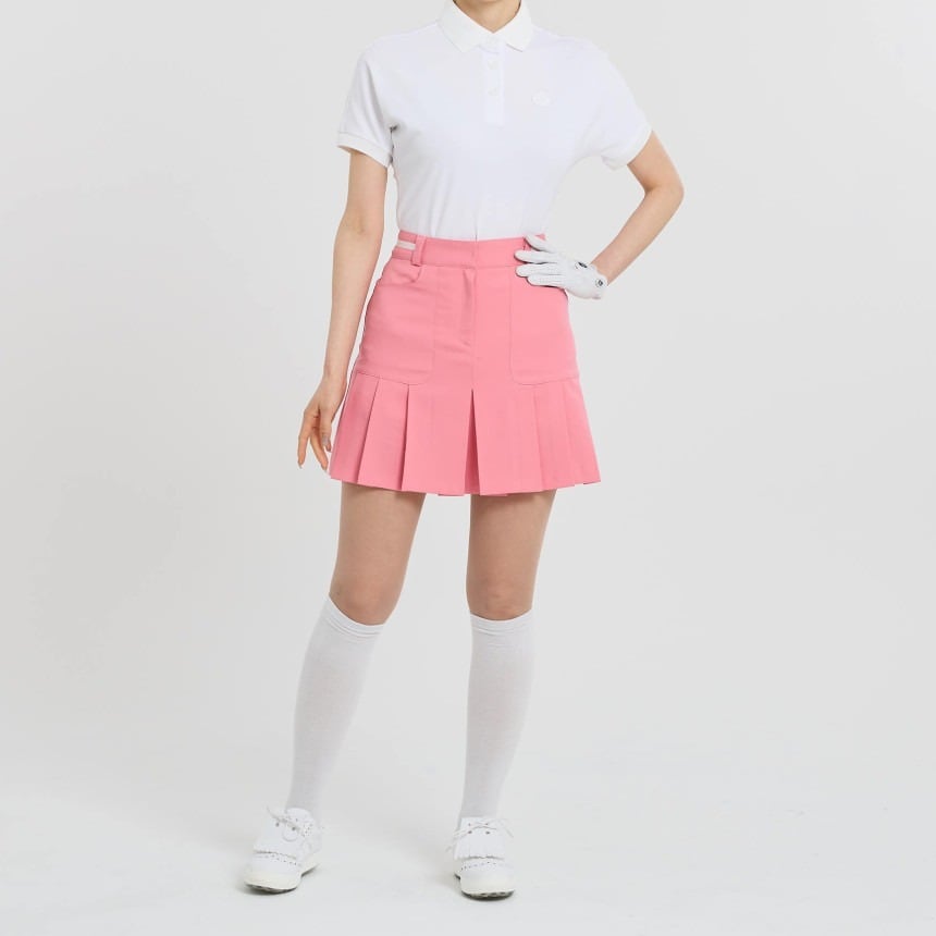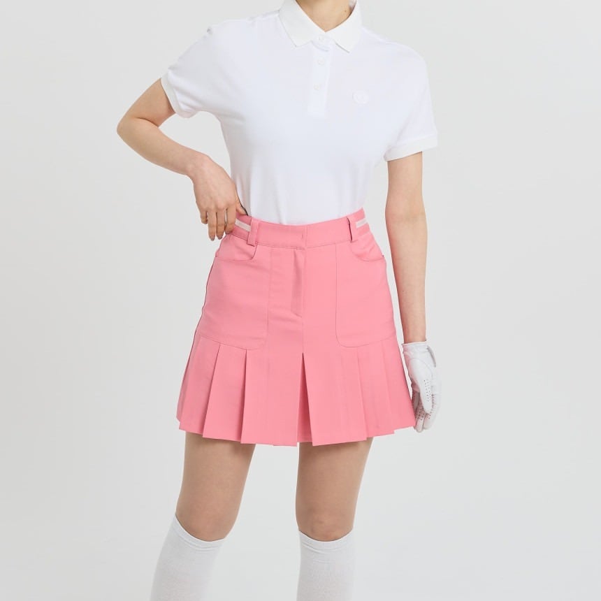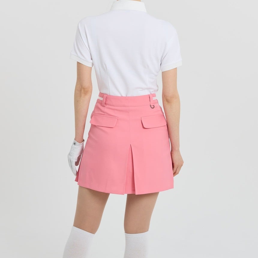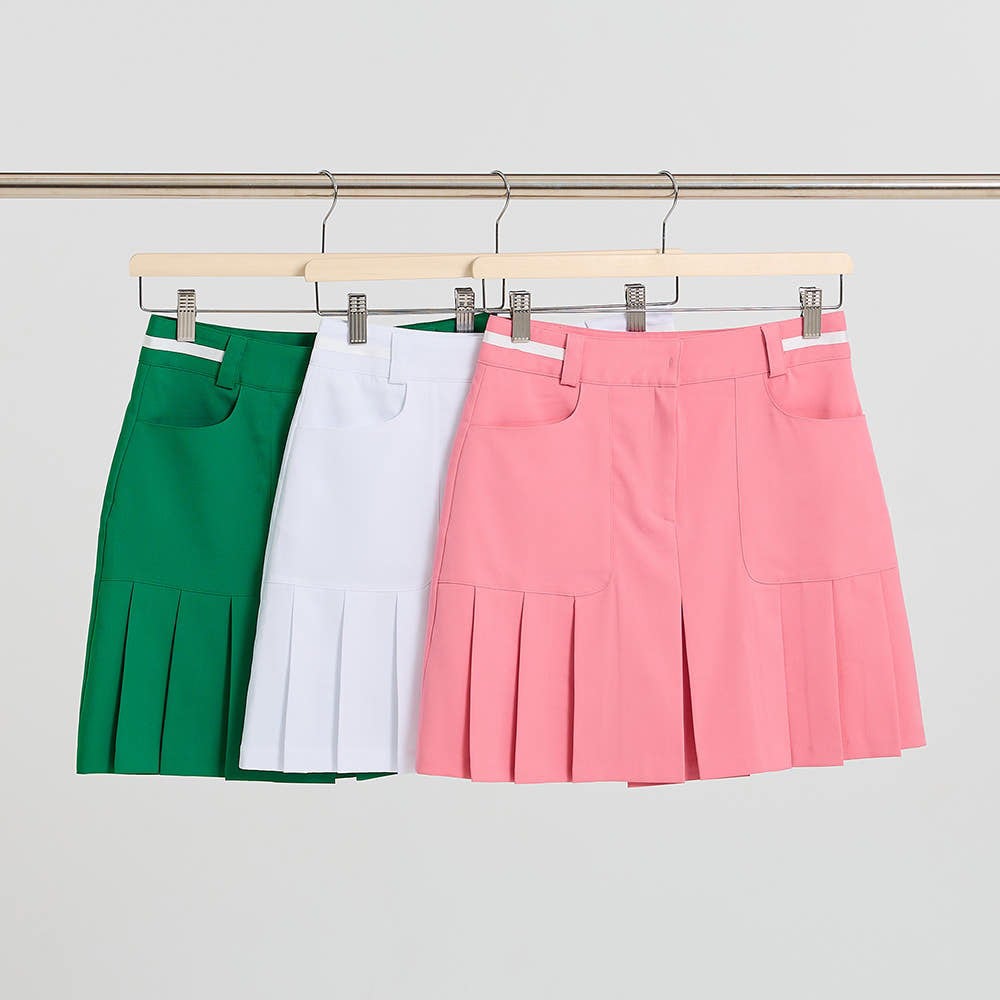 腰回りは広がりを抑えたスリムなシルエット、裾部分のみにボックスプリーツを施した、大人可愛い切り替えデザインのゴルフスカートです。