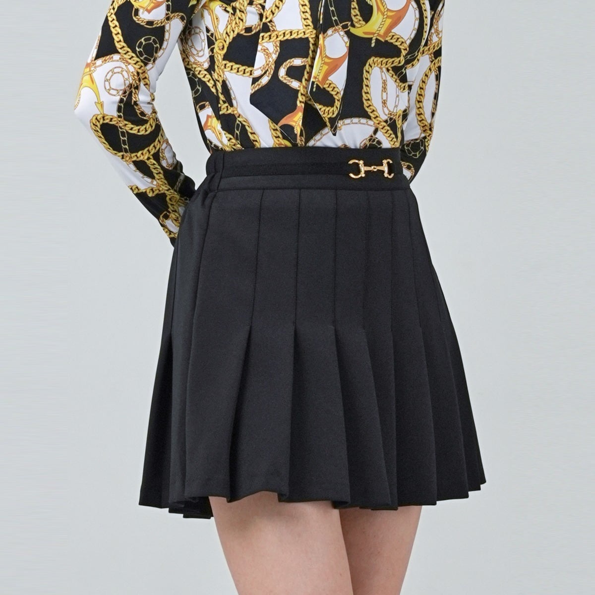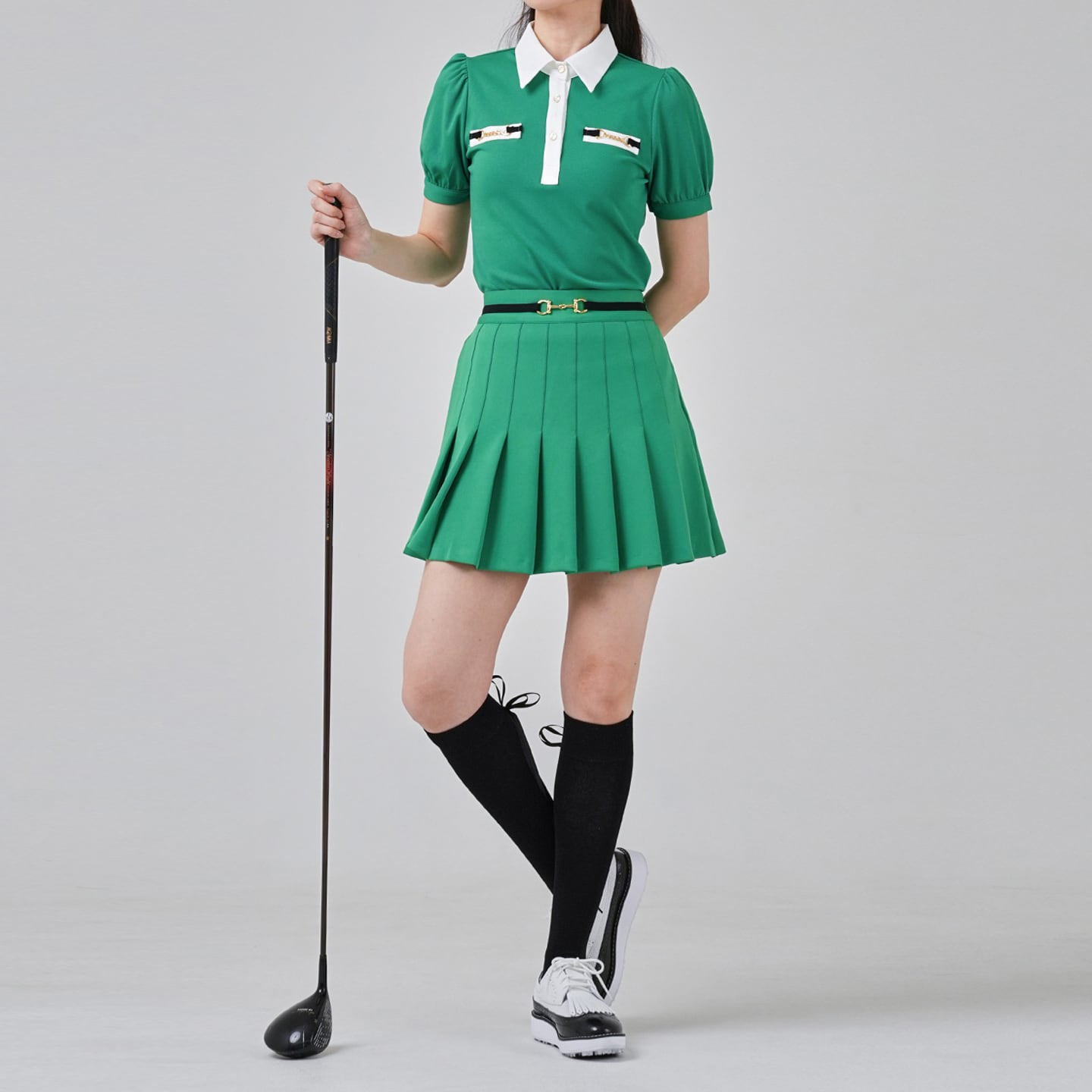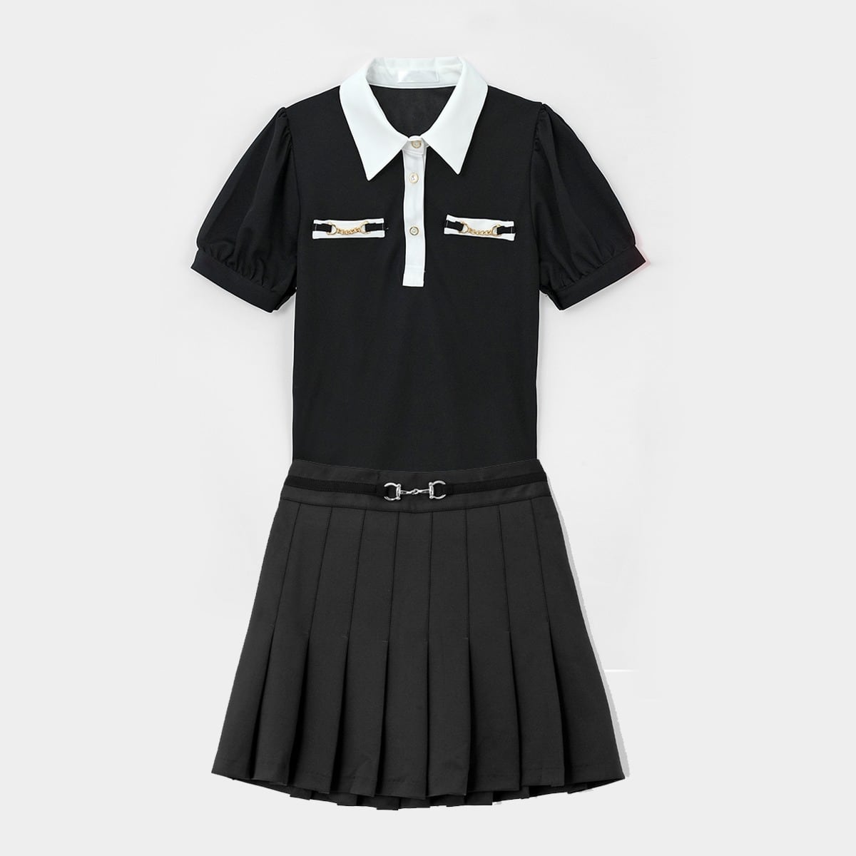 パフスリーブ ポロシャツ&ビットベルト プリーツスカート SET UP