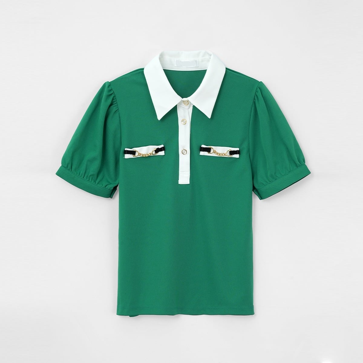 トップスは女性らしいパフスリーブと白襟のコントラストが顔周りを華やかに見せ、胸元のチェーンディテールが高級感を演出します。
